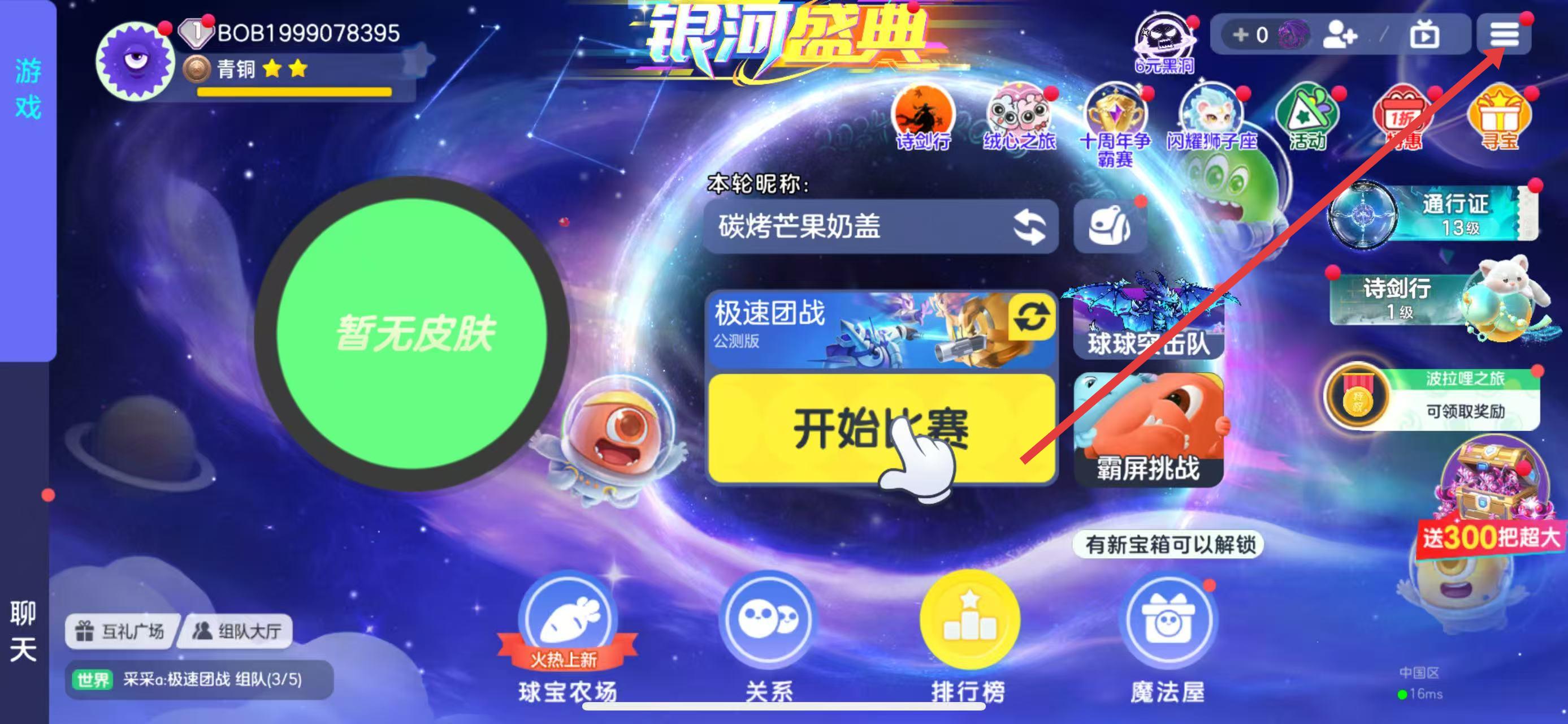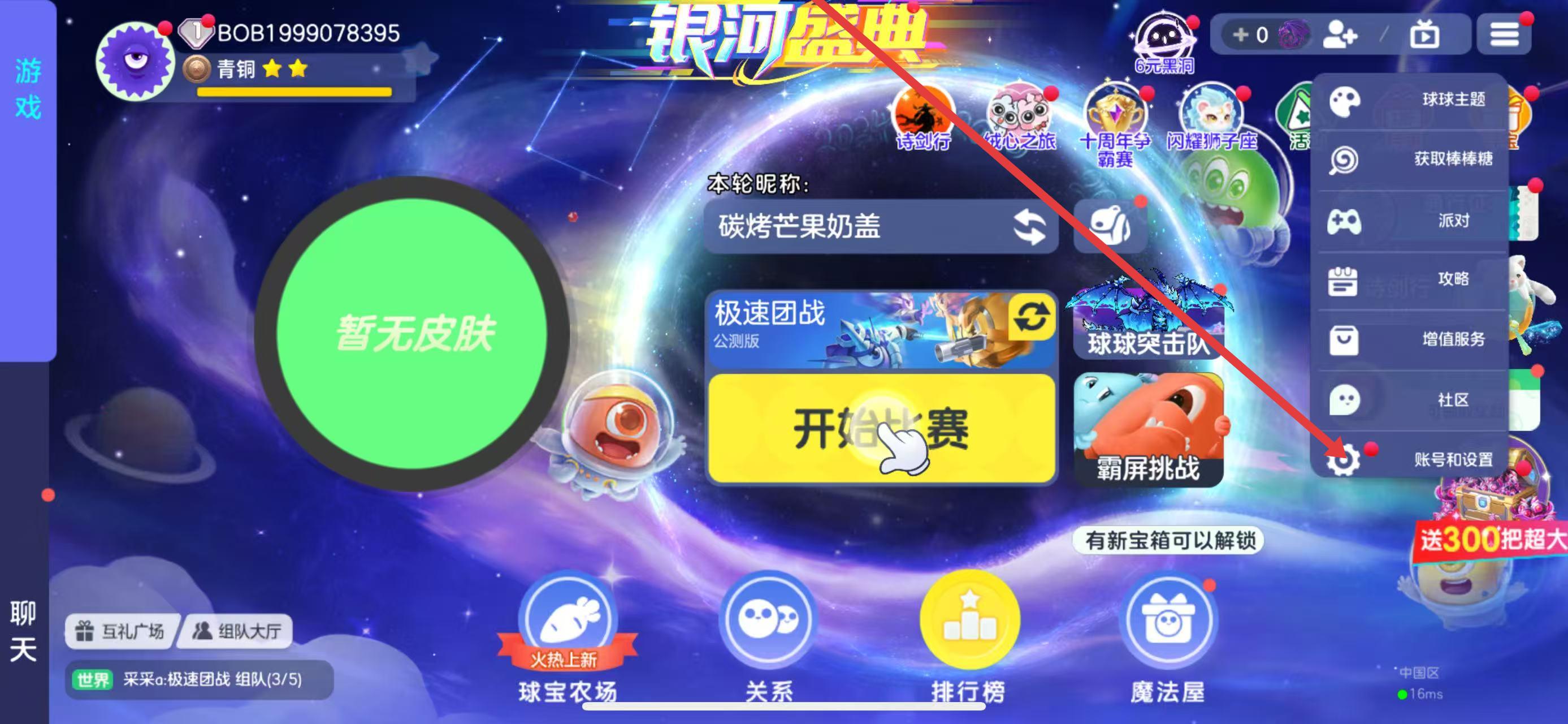 1、打開球球大作戰(zhàn)游戲,進(jìn)入主界面后,點(diǎn)擊左上角帶有紫色齒輪標(biāo)志的頭像,進(jìn)入個(gè)人信息相關(guān)頁面。