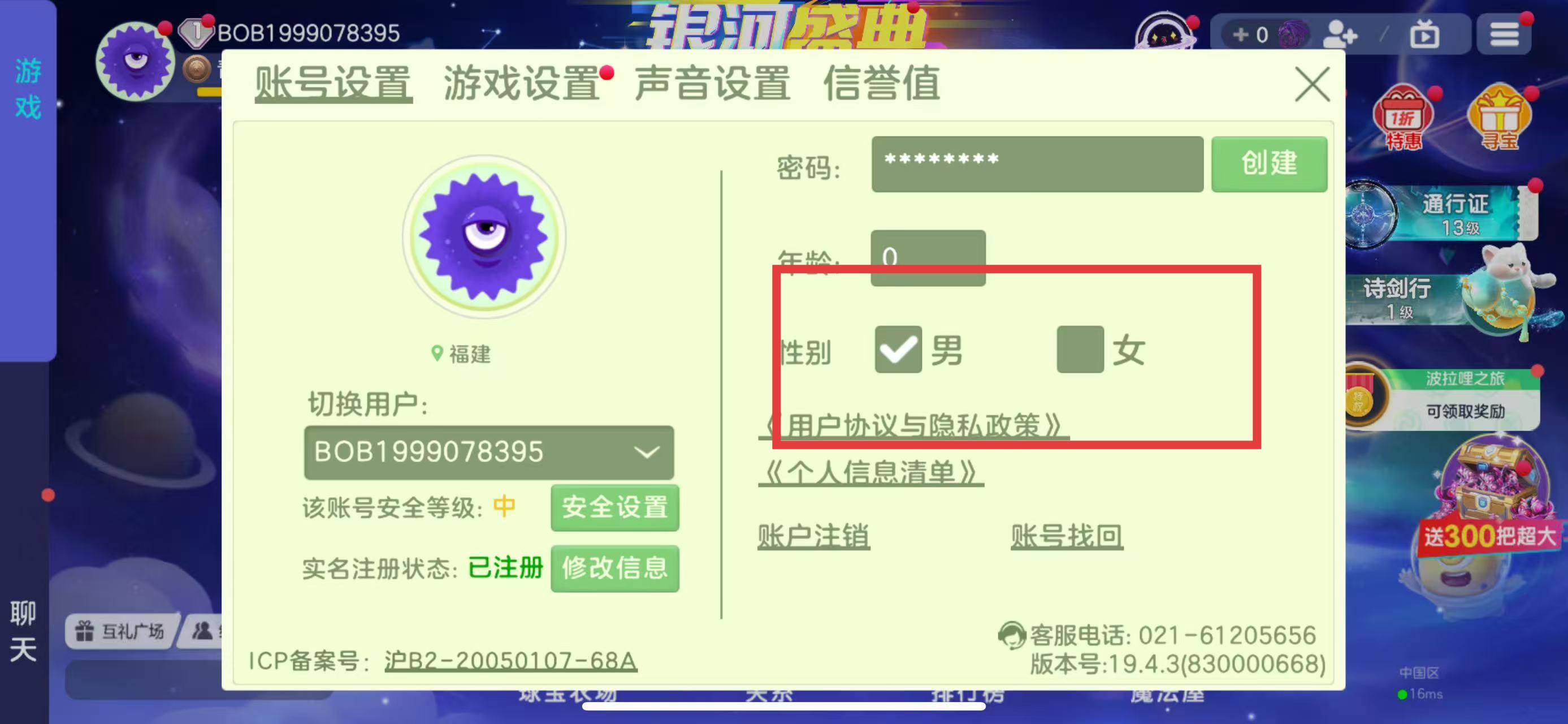 3、在賬號(hào)設(shè)置界面里,找到【性別】選項(xiàng),能看到“男”和“女”的選擇框 ,點(diǎn)擊想要更改的性別選項(xiàng),即可完成性別的修改。