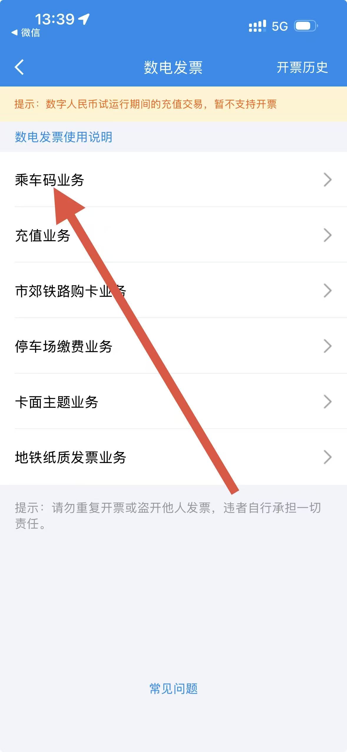 3、進入數(shù)電發(fā)票頁面后,選擇對應(yīng)的業(yè)務(wù)類型,比如乘車碼業(yè)務(wù)。