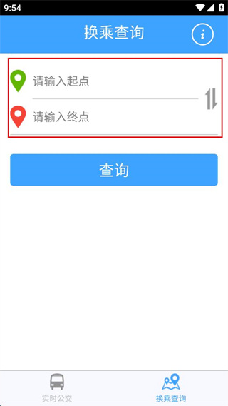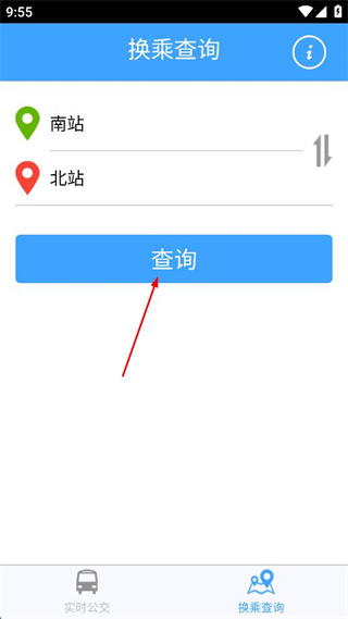 1、打開實(shí)時(shí)公交軟件進(jìn)入主界面,點(diǎn)擊底部換乘查詢選項(xiàng),切換至換乘查詢頁(yè)面。