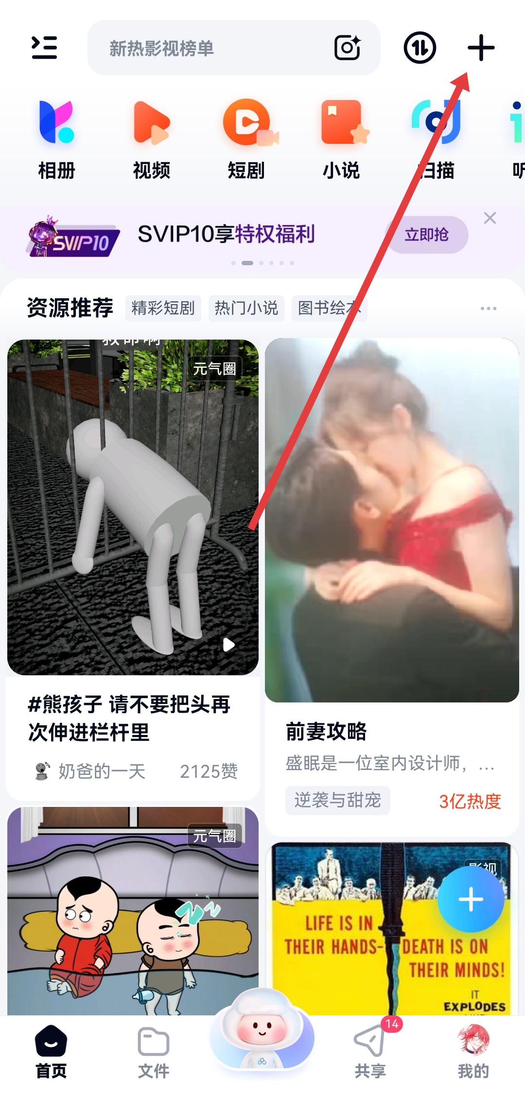 1、打開(kāi)百度網(wǎng)盤(pán)APP進(jìn)入軟件的首頁(yè),然后點(diǎn)擊右上角+號(hào)的圖標(biāo),彈出功能選擇的菜單。