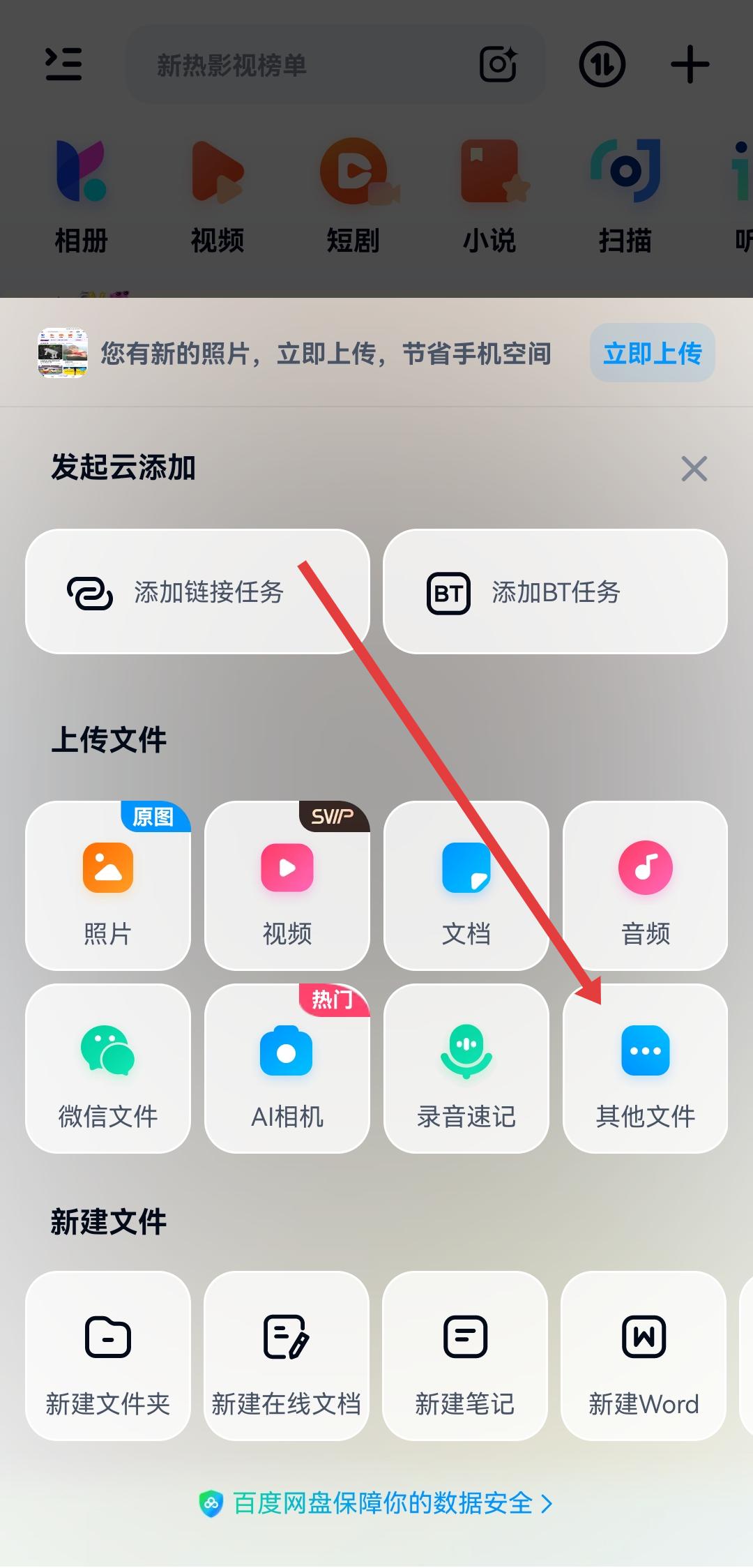 2、在彈出的功能菜單中,我們這邊需要點(diǎn)擊其他文件的選項(xiàng),然后進(jìn)入上傳文件選擇的界面。