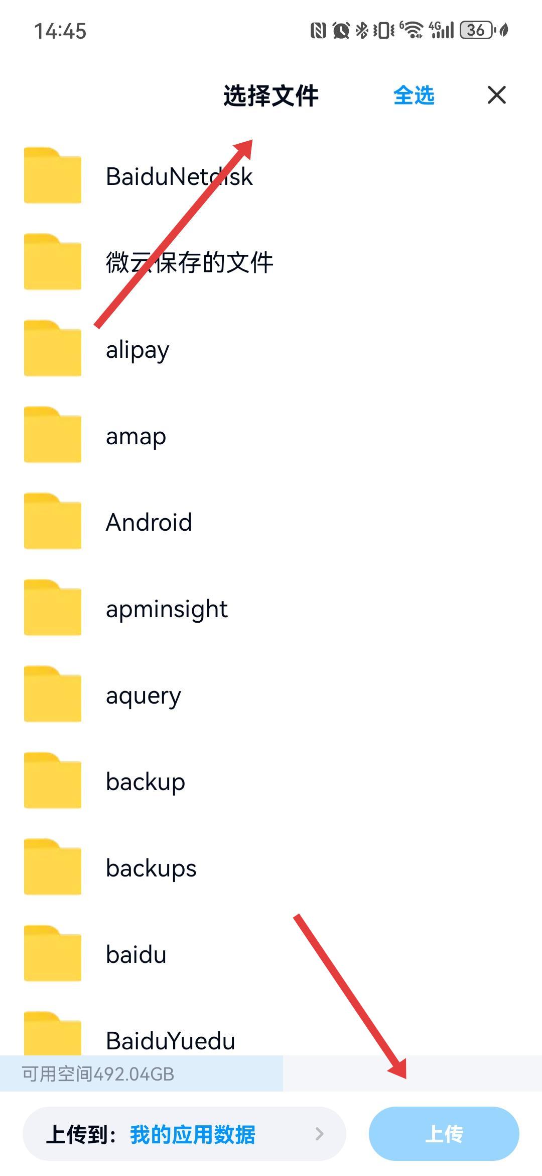 3、在選擇文件界面中找到并選中要上傳的文件夾后,點(diǎn)擊右下角上傳按鈕,將文件夾上傳至百度網(wǎng)盤(pán)。