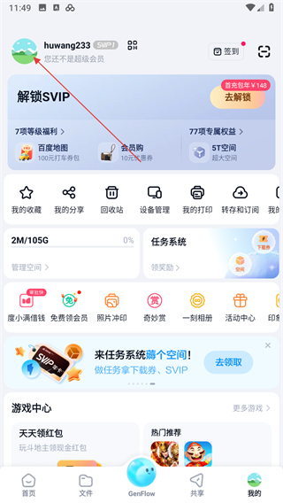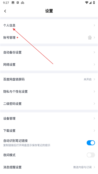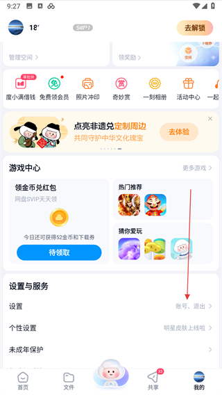 1、打開(kāi)百度網(wǎng)盤(pán)APP,在我的頁(yè)面,點(diǎn)擊設(shè)置選項(xiàng)。