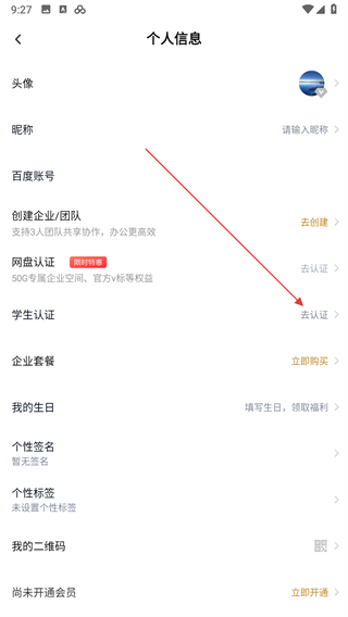 3、在個(gè)人信息頁(yè)面,點(diǎn)擊學(xué)生認(rèn)證的去認(rèn)證選項(xiàng)。