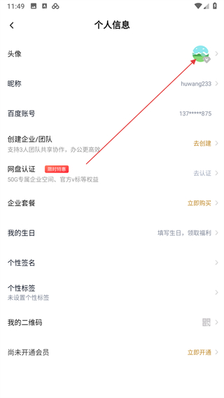 3、在個(gè)人信息頁(yè)面點(diǎn)擊頭像右側(cè)箭頭,彈出操作選項(xiàng)。