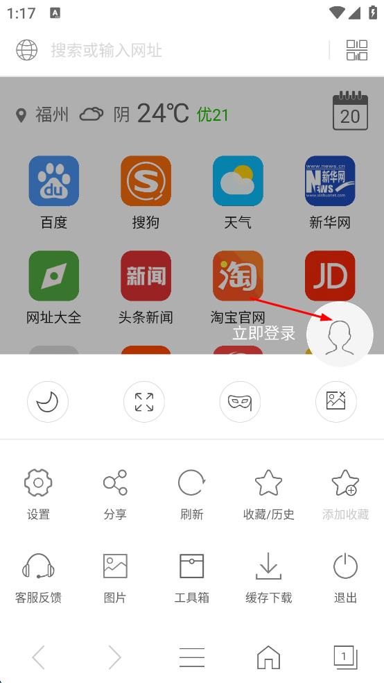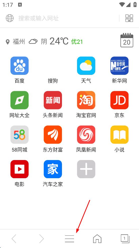 1、打開瀏覽器類軟件,點(diǎn)擊頁(yè)面底部中間的菜單圖標(biāo),彈出功能菜單。
