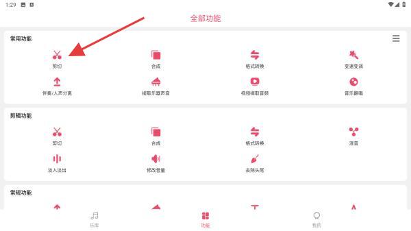 2、在全部功能頁面的常用功能區(qū)域,找到并點擊剪切圖標,跳轉(zhuǎn)至剪切編輯界面。