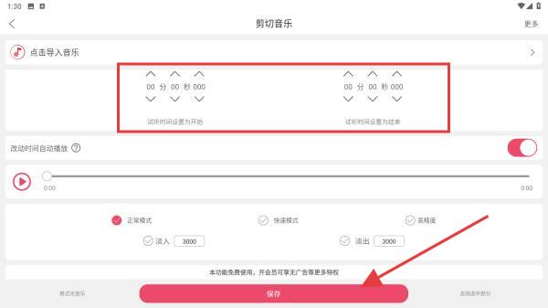 3、進入剪切音樂頁面后,點擊頂部點擊導(dǎo)入音樂,從手機本地文件中選擇需剪切的音頻文件,剪切后點擊保存。