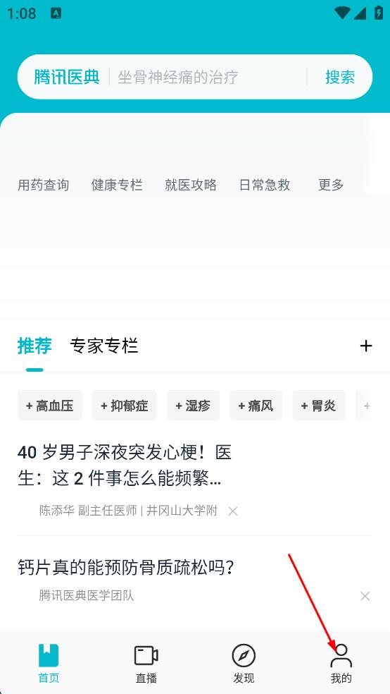 2、在騰訊醫(yī)典首頁,點(diǎn)擊右下角我的,進(jìn)入個(gè)人頁面。