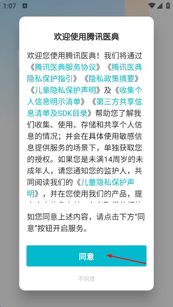 1、打開騰訊醫(yī)典,在彈出的服務(wù)協(xié)議等提示頁面,點(diǎn)擊同意,進(jìn)入騰訊醫(yī)典首頁。