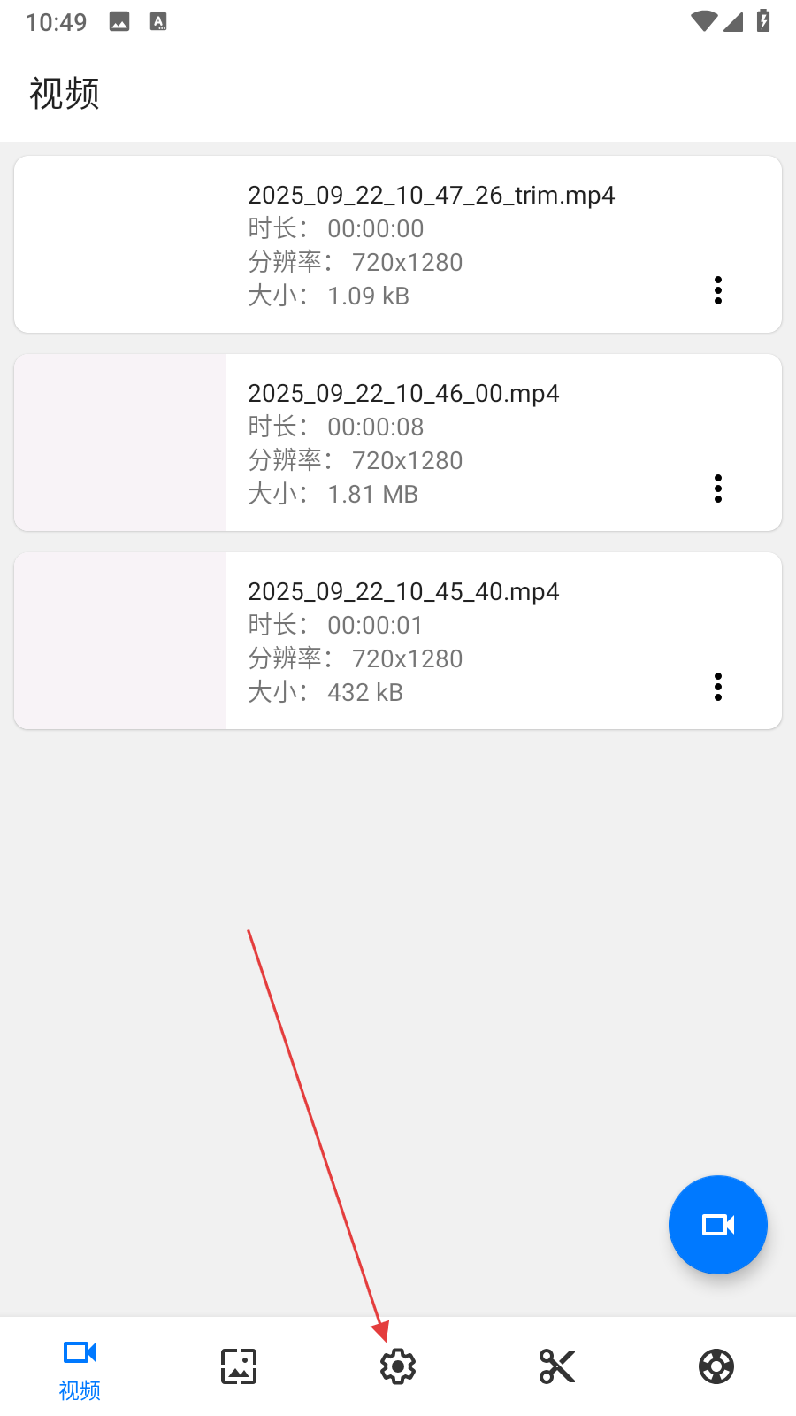 1、打開 Screen Recorder 應(yīng)用,在視頻頁面點(diǎn)擊底部的齒輪形狀設(shè)置圖標(biāo),進(jìn)入設(shè)置界面。