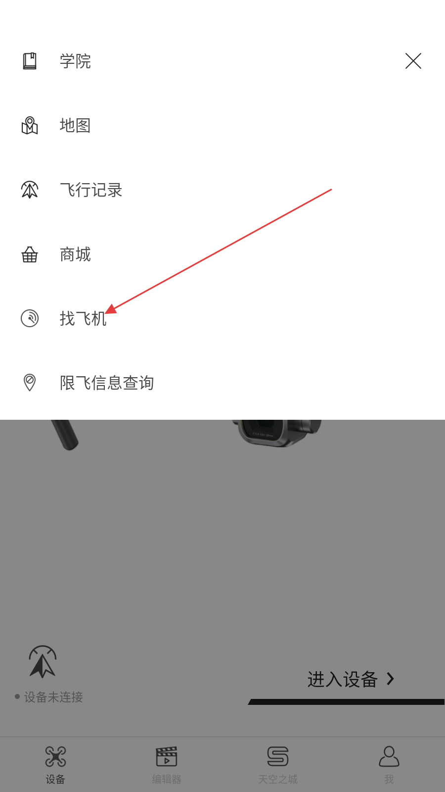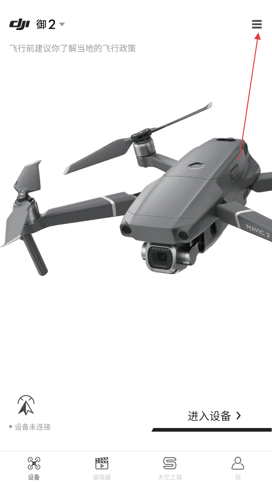 1、打開DJIGO4軟件進(jìn)入主界面,點(diǎn)擊界面右上角三條橫線圖標(biāo)打開功能菜單。
