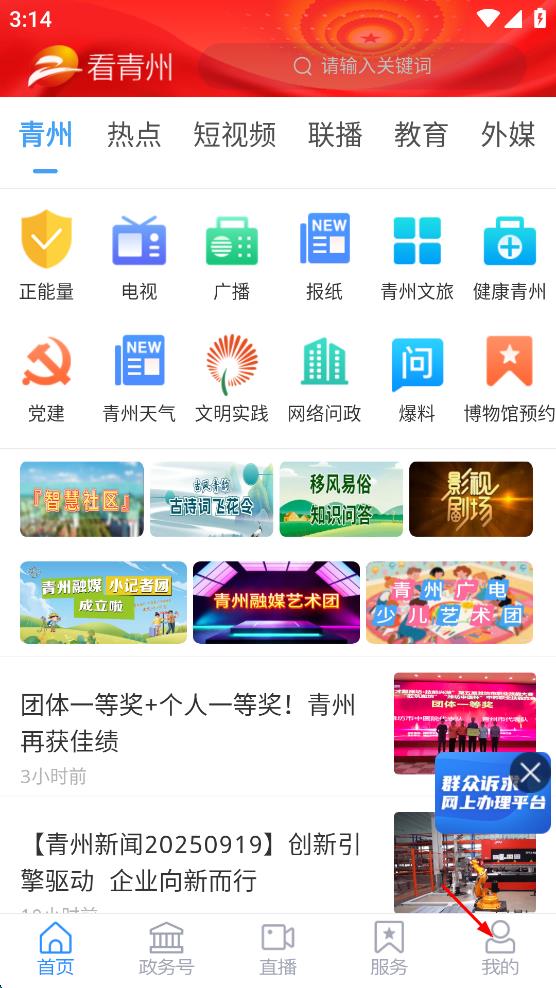 1、打開看青州軟件,進入首頁后,找到頁面右下角的“我的”選項,點擊該選項,進入個人頁面。