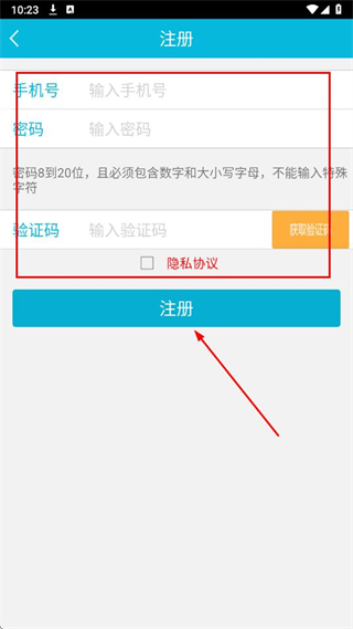 3、輸入手機(jī)號(hào)、設(shè)置密碼,輸入驗(yàn)證碼,勾選隱私協(xié)議,點(diǎn)擊注冊(cè),完成賬號(hào)注冊(cè)。