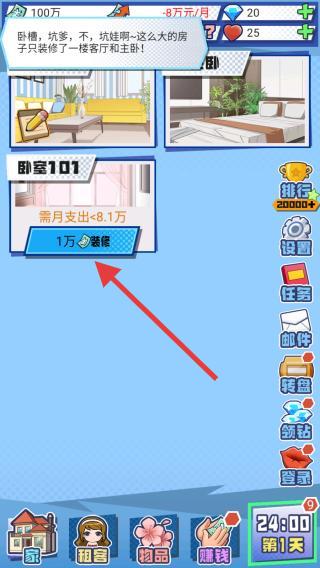 2、進(jìn)入到游戲場景內(nèi),目前只裝修了一樓客廳和主臥,玩家需要通過不斷的賺錢來進(jìn)行裝修。
