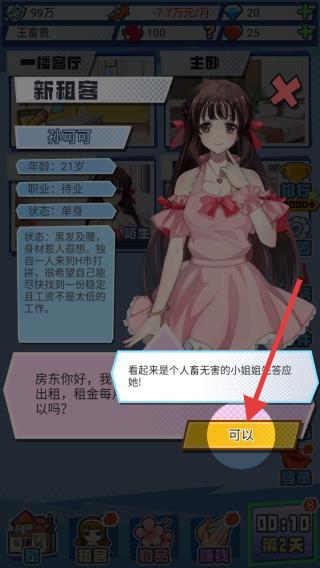 3、來了一位新租客,可以與他人進(jìn)行合租賺取金幣,點(diǎn)擊可以后開啟一段與人合租的階段。