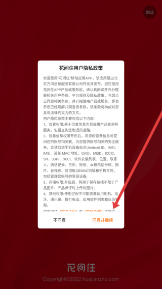 1、在花間住隱私政策彈窗中,點擊同意并繼續(xù)按鈕,接受用戶隱私政策,進入應用后續(xù)界面。