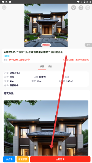 3、進入建筑設計頁面后,可下拉瀏覽新中式別墅等設計細節(jié),也能點擊立即咨詢了解方案詳情。