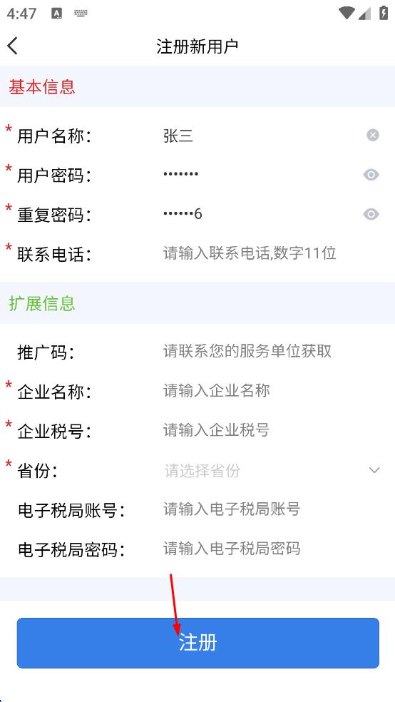 4、基本信息和擴(kuò)展信息都填寫(xiě)完畢后,點(diǎn)擊“注冊(cè)”按鈕,即可完成智云e票APP的注冊(cè)操作。