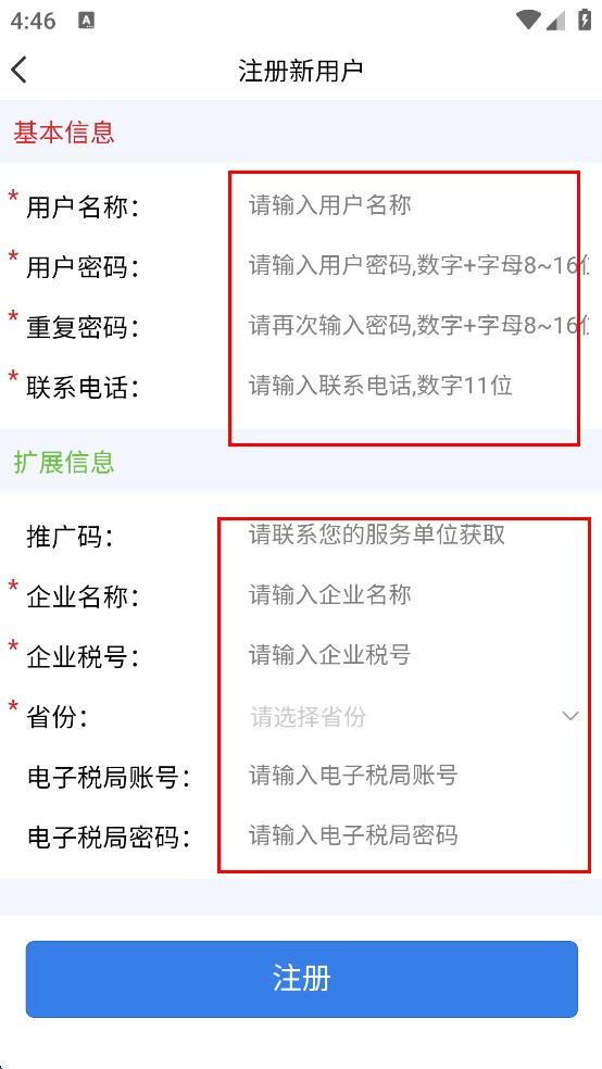 3、在注冊(cè)新用戶(hù)頁(yè)面,先填寫(xiě)基本信息,包括用戶(hù)名稱(chēng)、用戶(hù)密碼、重復(fù)密碼、聯(lián)系電話(huà),接著填寫(xiě)擴(kuò)展信息等相關(guān)信息。