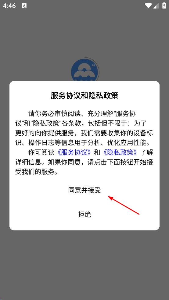 1、打開(kāi)智云e票APP,會(huì)彈出服務(wù)協(xié)議和隱私政策提示框,仔細(xì)閱讀相關(guān)內(nèi)容后,點(diǎn)擊“同意并接受”按鈕,進(jìn)入APP登錄界面。