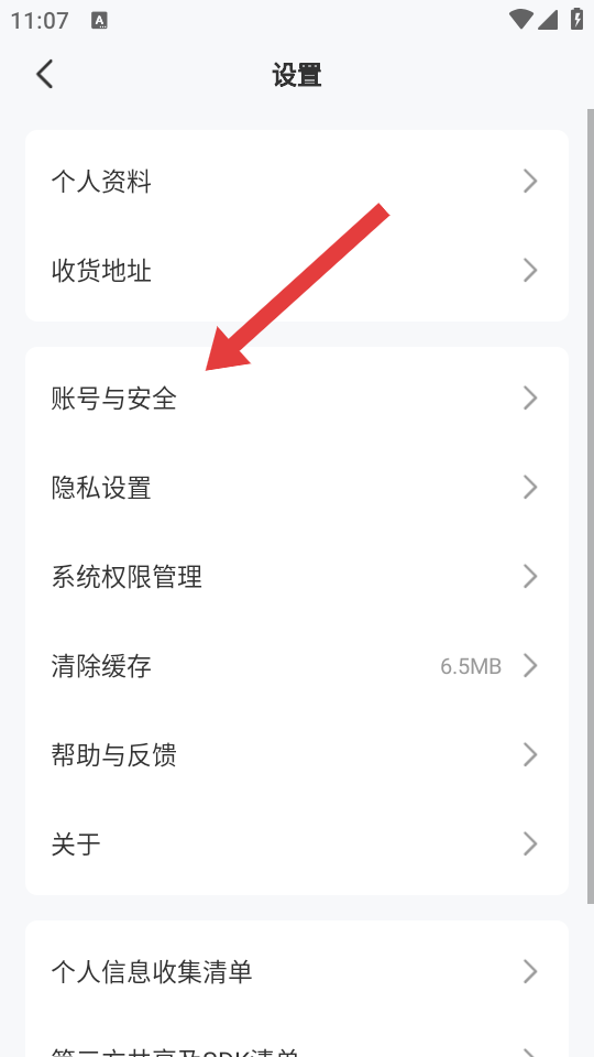 2、在設置頁面,點擊賬號與安全選項,進入賬號與安全的界面。