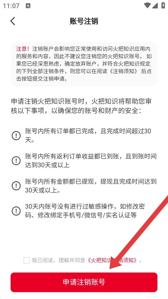 4、在賬號注銷頁面,勾選同意注銷須知后,點擊申請注銷賬號按鈕,提交注銷申請。