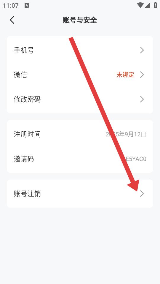 3、在賬號與安全頁面,點擊賬號注銷選項,進入賬號注銷說明頁面。