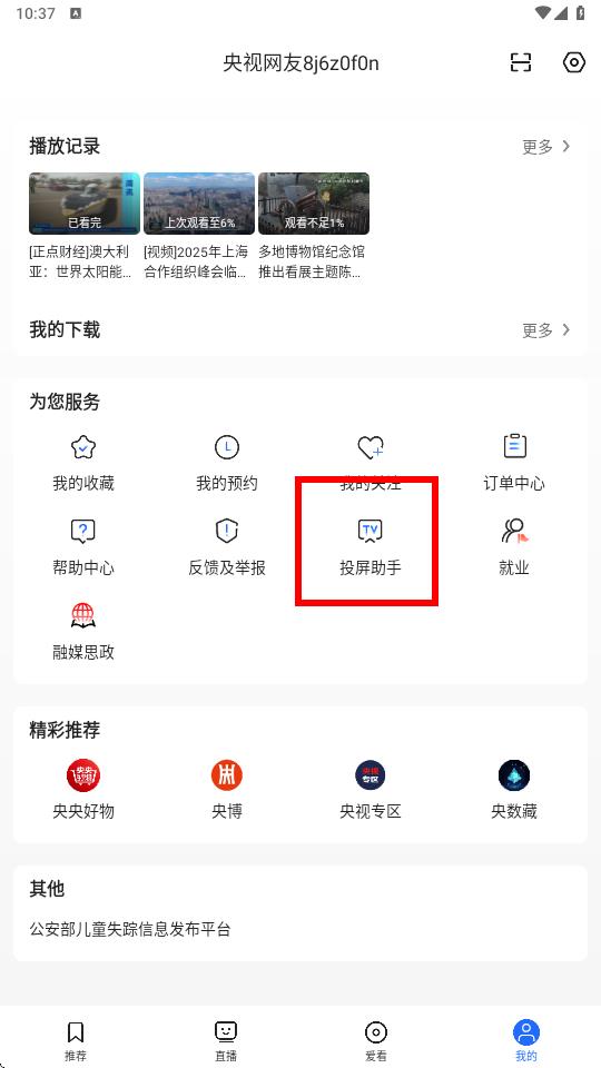 2、在個人中心頁面,找到投屏助手選項并點擊進入。