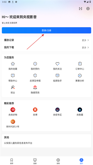 1、打開央視影音App,點擊底部導(dǎo)航欄最右側(cè)的我的,進入個人中心頁面。