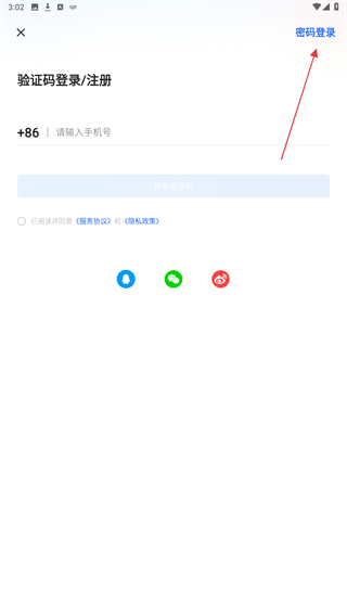 3、在登錄/注冊的頁面內(nèi),點擊右上方密碼登錄的按鈕。