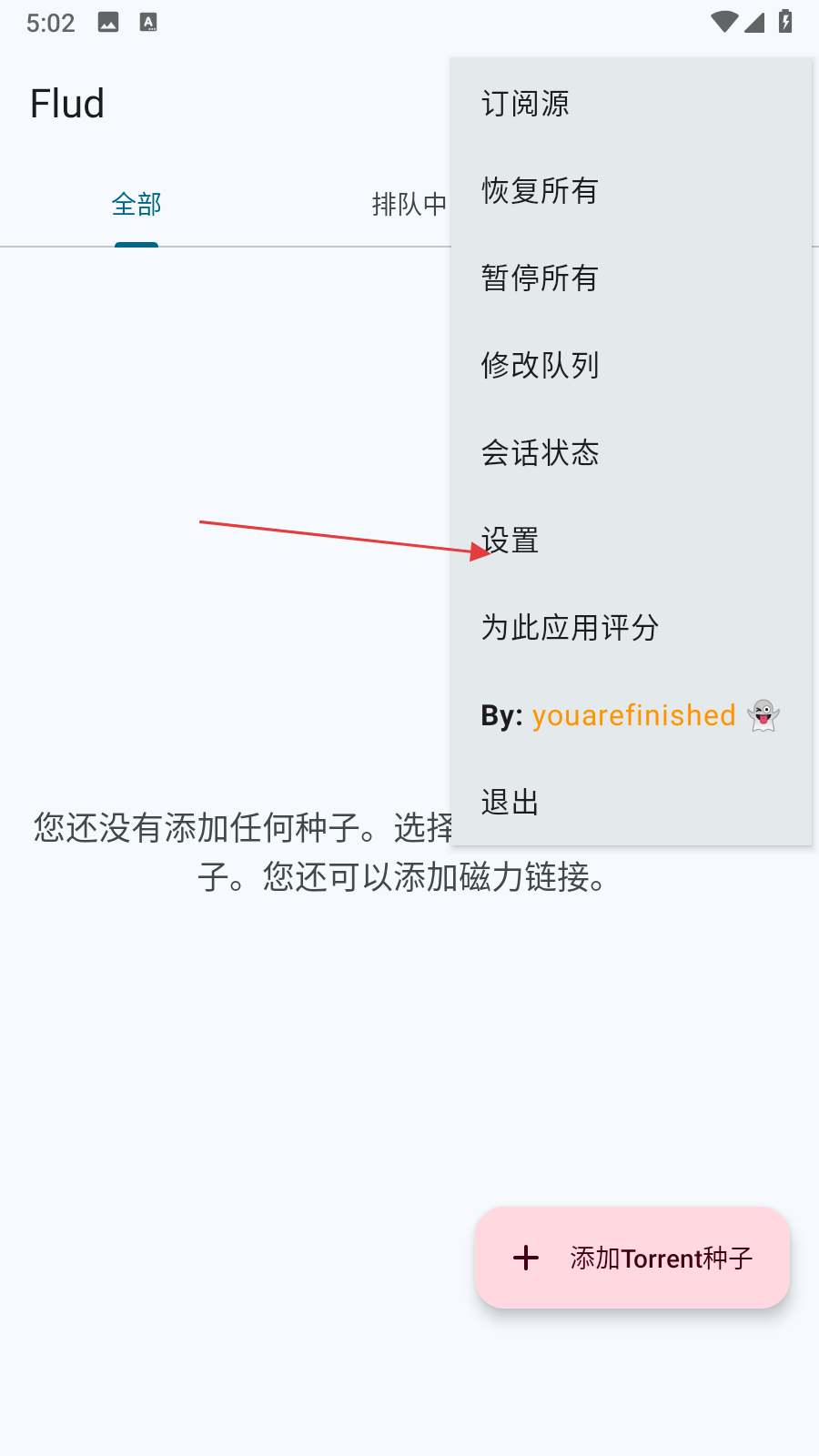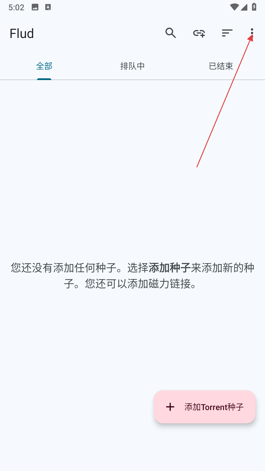 1、打開(kāi)Flud應(yīng)用,點(diǎn)擊界面右上角的三點(diǎn)菜單圖標(biāo),彈出包含設(shè)置等選項(xiàng)的菜單列表。