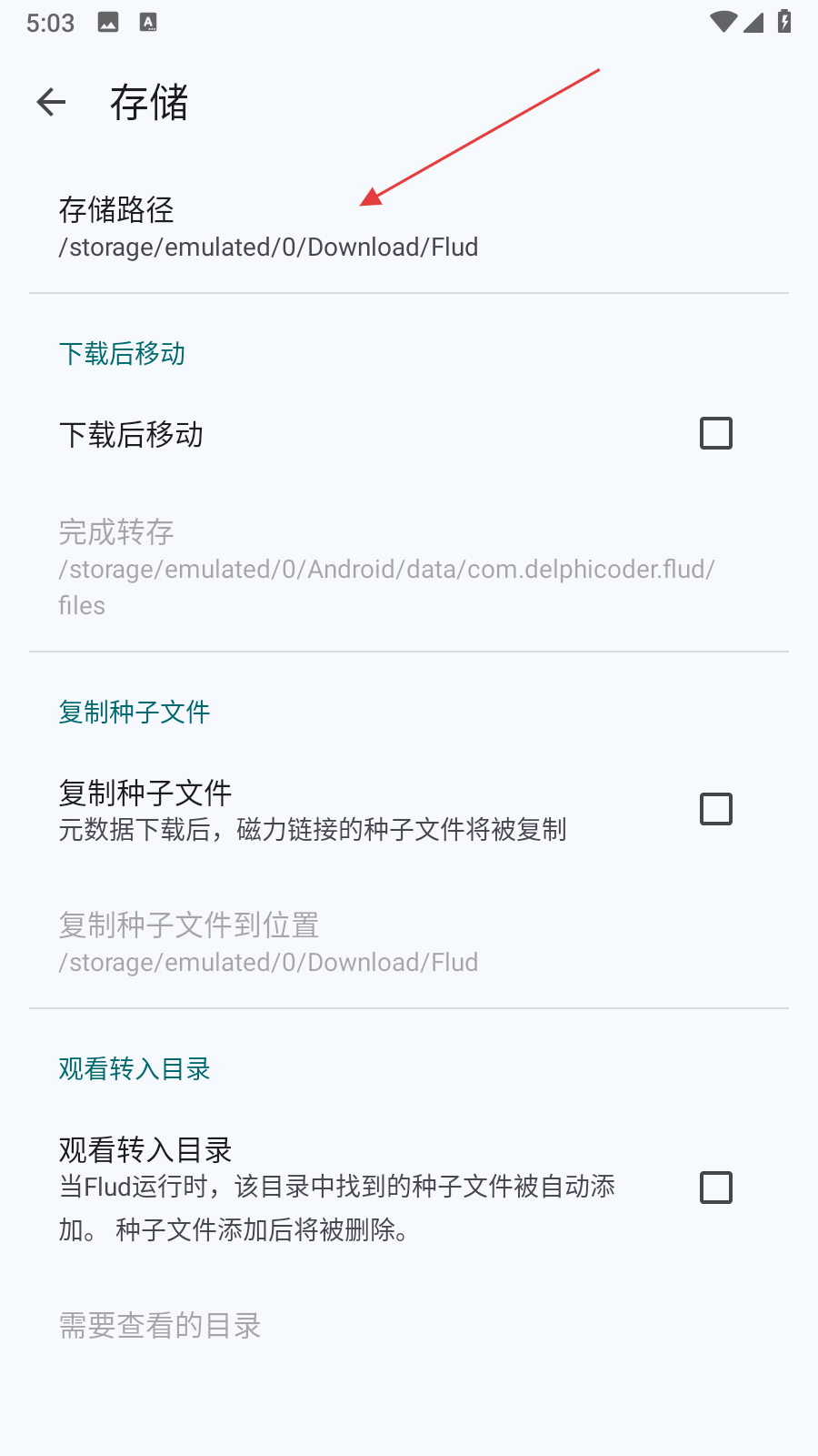 4、在存儲(chǔ)設(shè)置界面,點(diǎn)擊存儲(chǔ)路徑,然后選擇或輸入新的存儲(chǔ)路徑,即可完成Flud存儲(chǔ)路徑的更改。