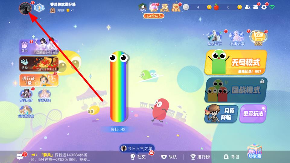 1、打開(kāi)貪吃蛇大作戰(zhàn)游戲,進(jìn)入游戲主界面,點(diǎn)擊左上角自己的頭像,進(jìn)入個(gè)人信息界面。