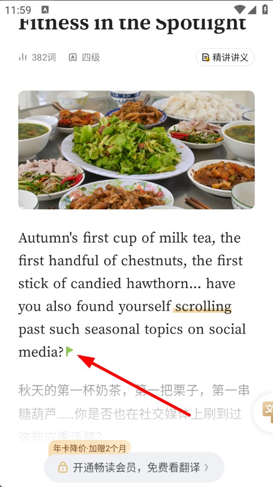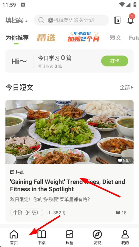 1、打開扇貝閱讀APP,進(jìn)入首頁(yè),選擇一篇想要閱讀的短文,點(diǎn)擊進(jìn)入文章界面。
