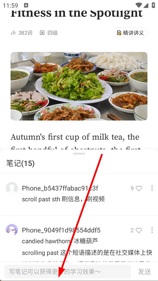 3、在下方彈出的筆記輸入框中,輸入你對(duì)該單詞或句子的理解、注釋等內(nèi)容即可。