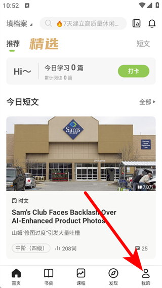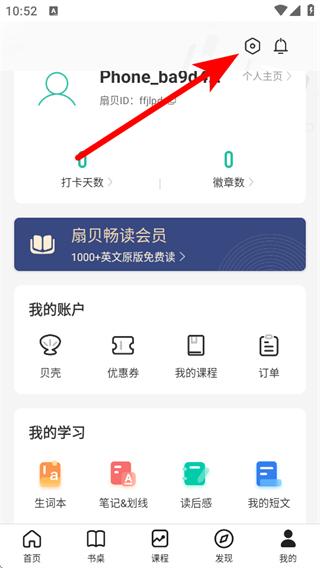 1、在扇貝閱讀app首頁(yè),點(diǎn)擊右下角我的選項(xiàng),進(jìn)入個(gè)人頁(yè)面。