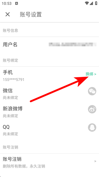4、在賬號(hào)設(shè)置頁(yè)面,點(diǎn)擊手機(jī)右側(cè)的換綁按鈕,即可進(jìn)行手機(jī)號(hào)碼換綁操作。