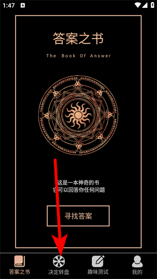 1、在答案之書主界面,點擊下方?jīng)Q定轉(zhuǎn)盤選項,進入決定轉(zhuǎn)盤頁面。