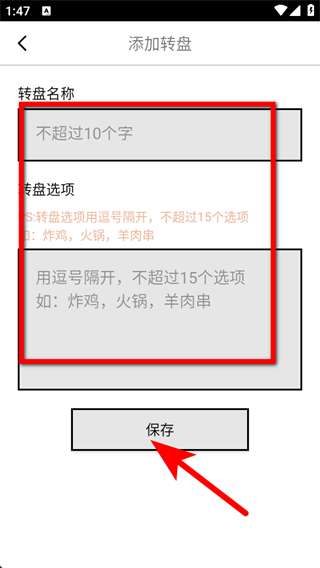 4、輸入轉(zhuǎn)盤名稱和轉(zhuǎn)盤選項,點擊保存按鈕,即可添加新的決定轉(zhuǎn)盤。