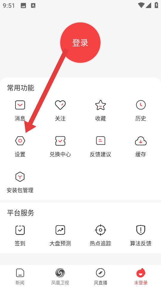 1、打開鳳凰視頻相關(guān)平臺,進(jìn)入個人功能頁面,找到并點(diǎn)擊設(shè)置的選項(xiàng),進(jìn)入設(shè)置界面。