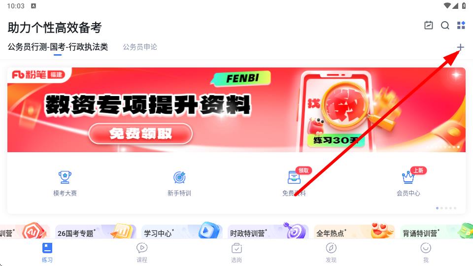 1、打開粉筆APP進入主界面,點擊右上角的+號圖標,進入添加題庫頁面。