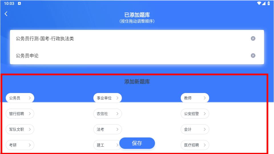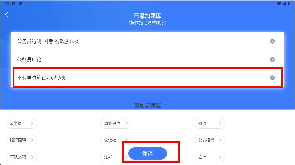 3、選擇好具體題庫事業(yè)單位筆試-聯(lián)考A類后,點擊頁面下方的保存按鈕,即可成功添加所選題庫。