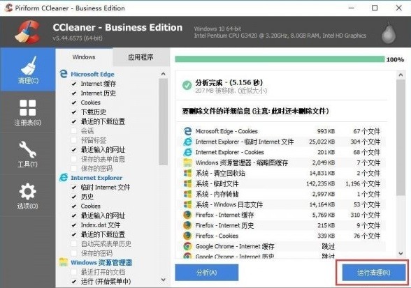 2.當(dāng)分析結(jié)束后,會(huì)在右側(cè)得出分析結(jié)果列表,這是點(diǎn)擊右下角的“運(yùn)行清理”按鈕即可。