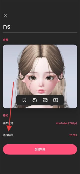 3、在創(chuàng)建項(xiàng)目頁面設(shè)置背景等相關(guān)內(nèi)容后,點(diǎn)擊選擇幀率選項(xiàng),設(shè)置幀率參數(shù)。