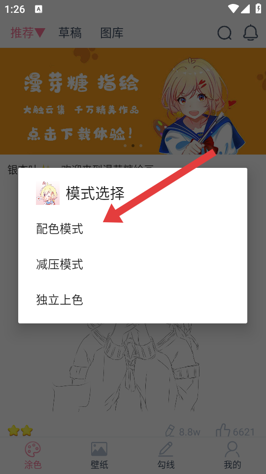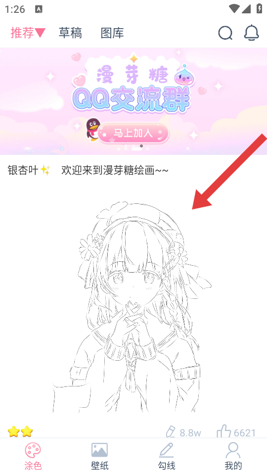 1、在漫芽糖繪畫首頁,點擊要進行涂色的線稿,進入涂色準備流程。
