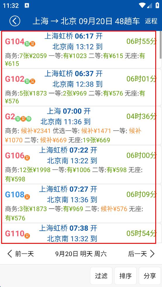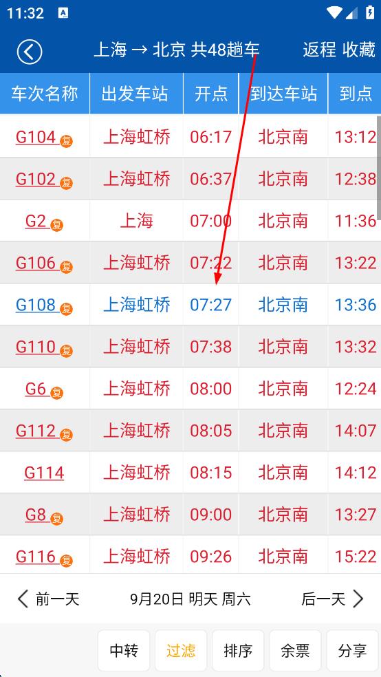 4、點(diǎn)擊查詢后,會(huì)顯示上海到北京的列車列表,包含車次名稱、出發(fā)車站、開點(diǎn)、到達(dá)車站、到點(diǎn)等信息,點(diǎn)擊具體車次,還能查看該車次不同座位類型的余票及價(jià)格等詳細(xì)內(nèi)容。