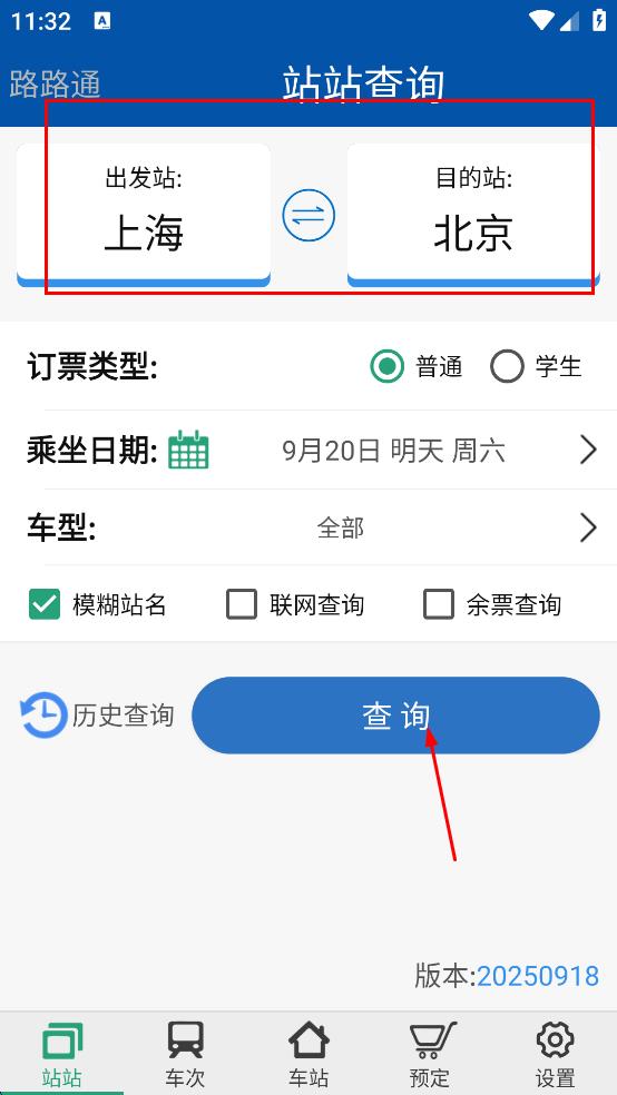 2、在主界面的“站站查詢”板塊,分別點(diǎn)擊“出發(fā)站”和“目的站”輸入框,輸入出發(fā)地“上?!焙湍康牡亍氨本保_定好出發(fā)和到達(dá)站點(diǎn)。