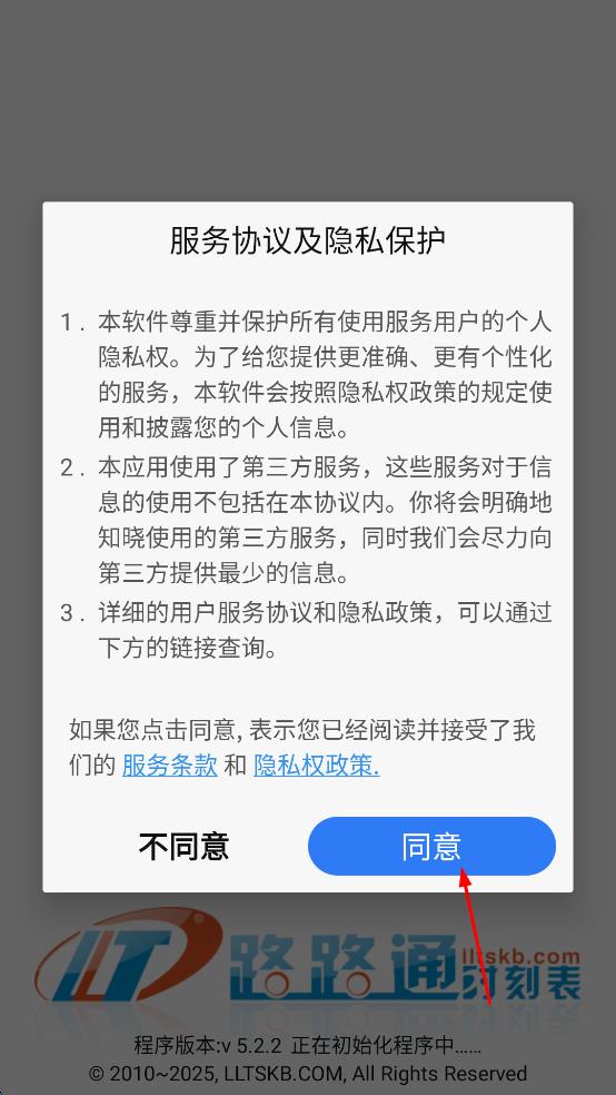 1、打開路路通軟件,會(huì)彈出“服務(wù)協(xié)議及隱私保護(hù)”提示框,仔細(xì)閱讀相關(guān)內(nèi)容后,若同意,點(diǎn)擊“同意”按鈕,進(jìn)入軟件主界面。